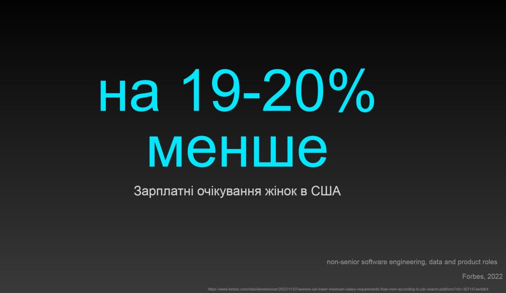 Зазвичай побажання по зарплаті у жінок на 20% менше, в Україні до 30% (Дані DOU 2023 року).