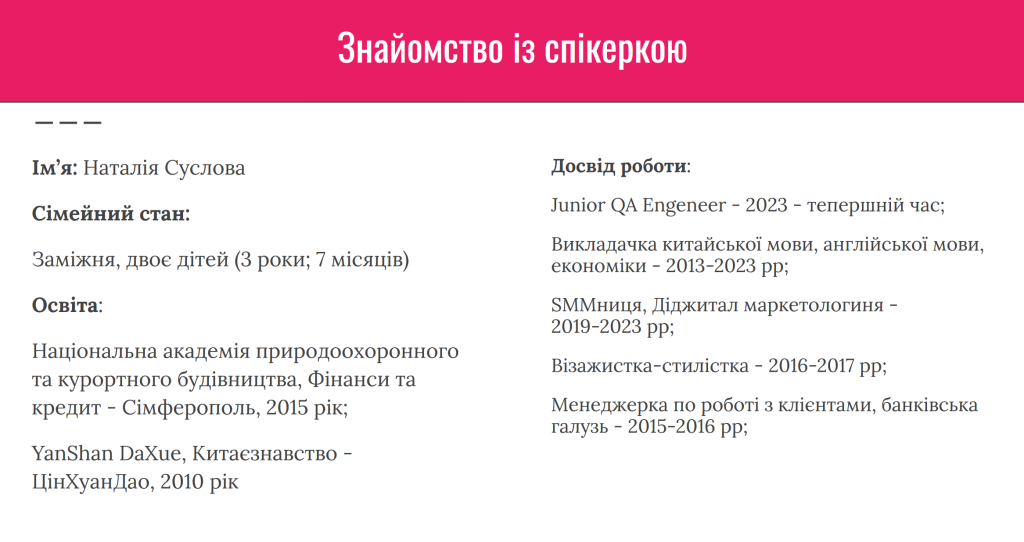 Чому я обрала саме QA? Чоловік сказав, що я така прискіплива і мені треба в QA іти. Я подумала, пішла до консультанта з кар’єри та HR, вони оцінили мої людські якості, попередній досвід, і сказали: «Так, дійсно можете йти або в QA, або в бізнес-аналітику». Я обрала QA.
